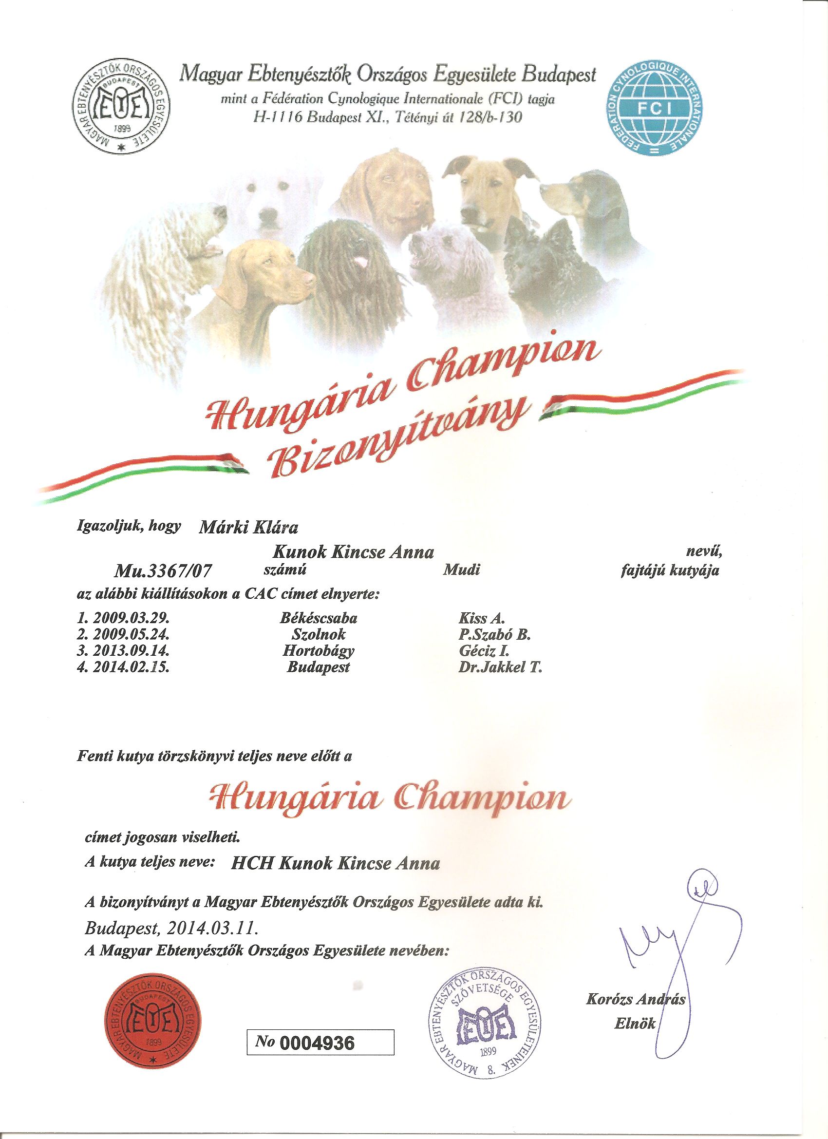 Törzskönyv Diszplázia Tenyészszemle HCH HSCH Kiállítási eredmények
